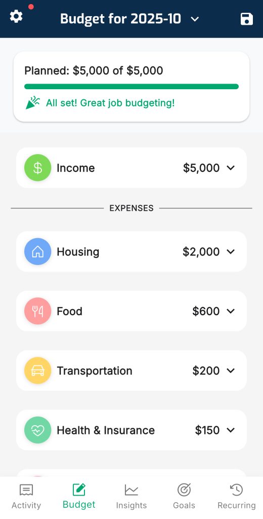 If you earn $5,000 in a month, you will distribute that entire amount across all your needs and goals until none remains unassigned.